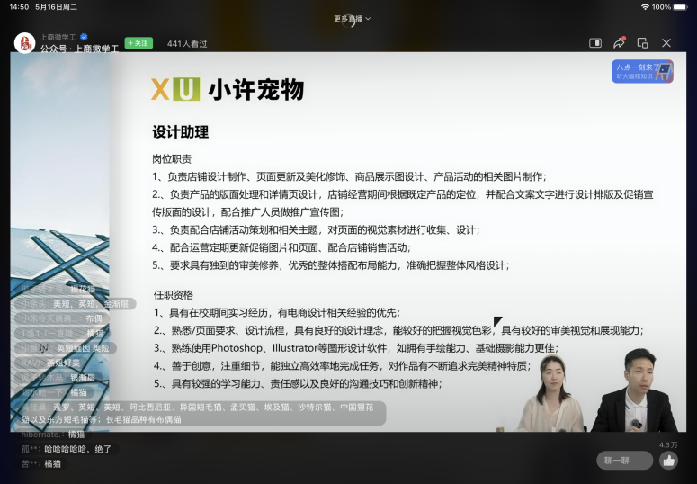 直播现场邀请了上海堡尼实业发展有限公司、东方童画(上海)教育科技有限公司、上海小许宠物用品有限公司。3家的企业代表亲临直播现场,企业代表、学院就业辅导员变身“主播”,逐一介绍企业岗位,详细讲解职位需求,提高面试成功率。直播浏览人数达467人次,喝彩次数达4.4万次。